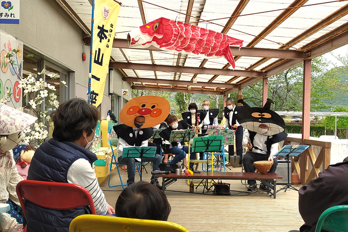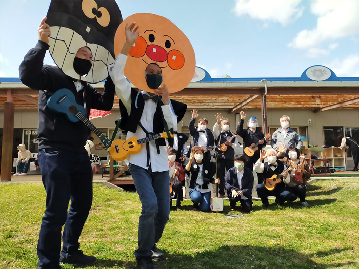 そんなブルーメンの入居者と縁があるメンバーが、子育てふれあいセンター「コークラボ」でアート作品の展覧会を開催。最終日の今日はコンサートが開かれ、ウクレレやスコップ三味線で古今東西の名ナンバーを演奏しました。
